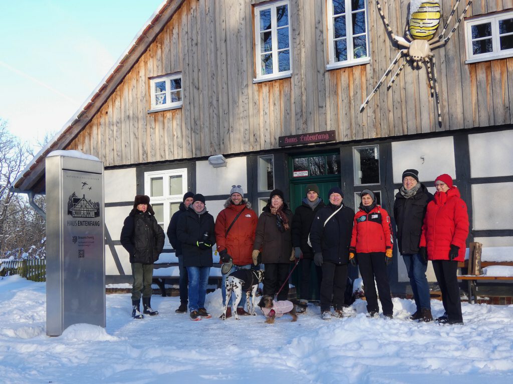 Am Samstag, 10.01.2026, führte uns Rangerin Anke Kätzel bei unserer Neujahrswanderung im Naturschutzgebiet Riddagshausen dieses Mal bei klirrender Kälte durch tiefen Schnee. Unsere Wanderung führte uns um den Mittelteich und über den Willke-Weg und die Buchhorst zurück zum Haus Entenfang. In der Nacht hatte es noch einmal geschneit. So konnten wir den selten gewordenen frischen Schnee und die abendliche Wintersonne richtig genießen.